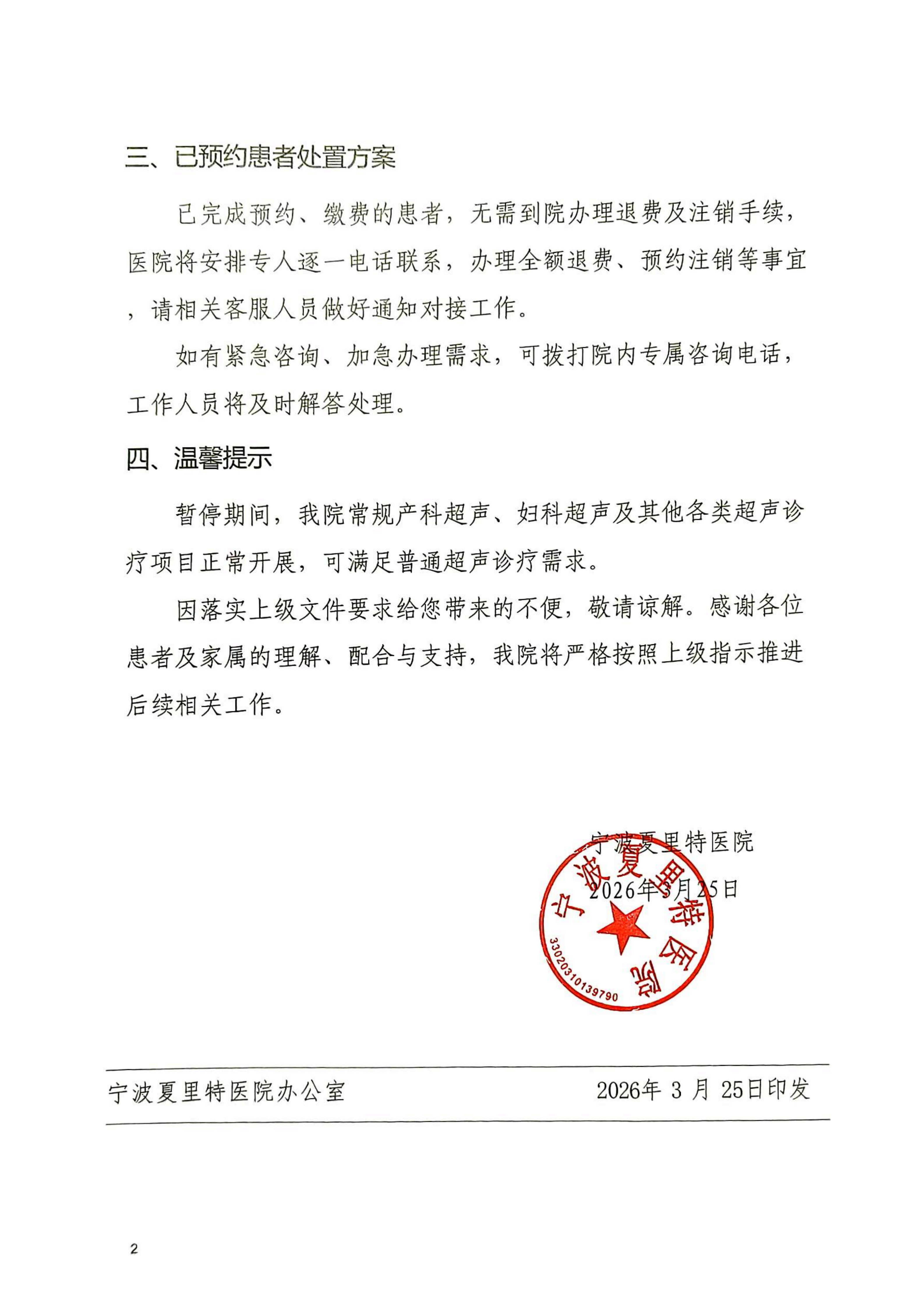 近日,海曙区卫生健康部门组织专题解读《国家卫生健康委办公厅关于进一步加强产前筛查服务管理的通知》(国卫办妇幼发[2025]6号)文件精神,并要求各医疗机构严格落实执行相关规定。为全面贯彻上级部署,进一步规范产前超声检查诊疗行为,我院已组织职工认真学习培训并落实相关文件精神,严格执行上级单位关于诊疗规范调整、医疗资源统筹调配的工作安排。经医院研究决定,暂停胎儿四维超声检查、胎儿小排畸超声检查两项诊疗项目,具体事宜通知如下:一、暂停项目自2026年3月25日起正式暂停